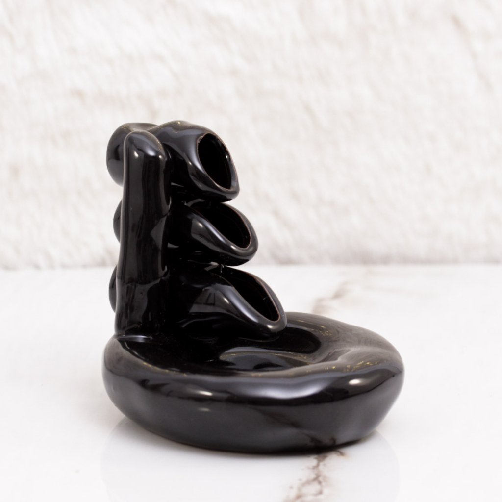 Dýmová Oáza – Bambusový proud klidu je keramická fontánka navržená pro zpětné vonné kužely (backflow), které po zapálení vytvářejí okouzlující vodopád kouře. Jemný dým proudí dolů jako tichý potůček, obtéká spirálovitě bambusovou konstrukci a vytváří vizuální efekt, který pohladí oči i duši. Tento klidný rituál se stává centrem každého duchovního prostoru.