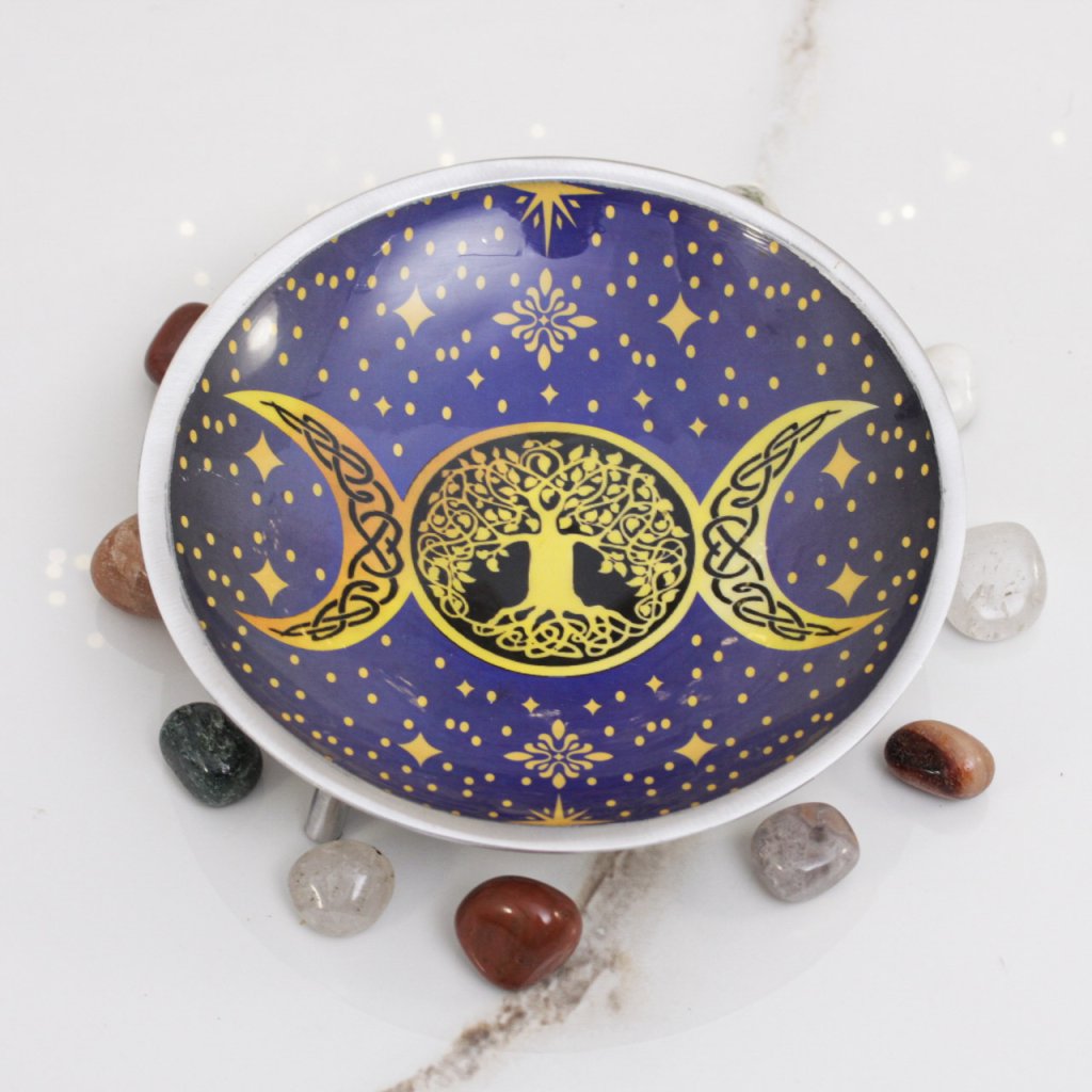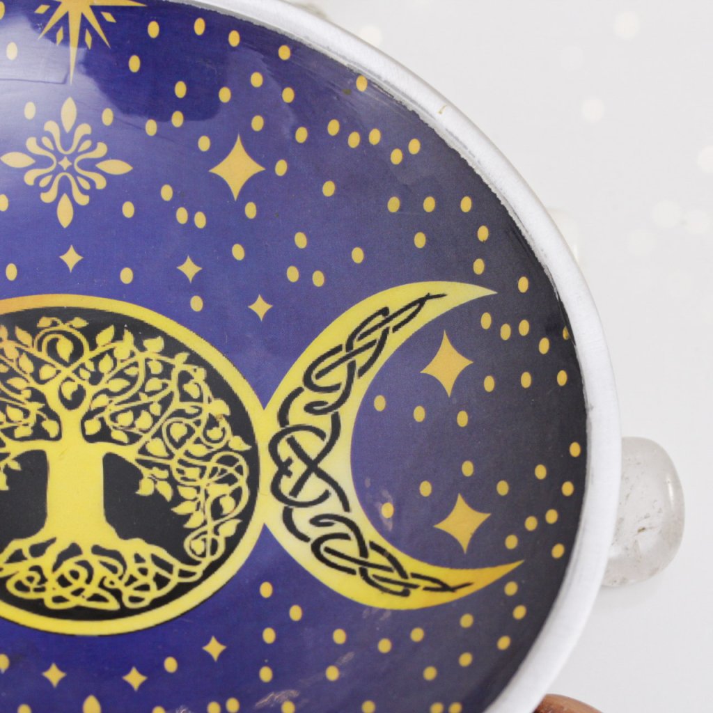 Talíř stojí na třech stabilních nožkách, díky nimž je pevný a bezpečný pro umístění svíček, krystalů, bylin nebo jiných rituálních předmětů. Kombinace kovového těla a magického designu přináší dokonalou rovnováhu mezi estetikou a funkčností. Je vhodný pro práci s cykly Měsíce, ženskými kruhy, ale i individuální rituály a meditace.