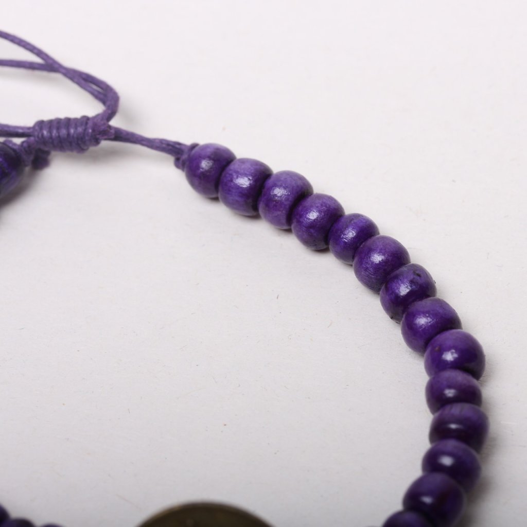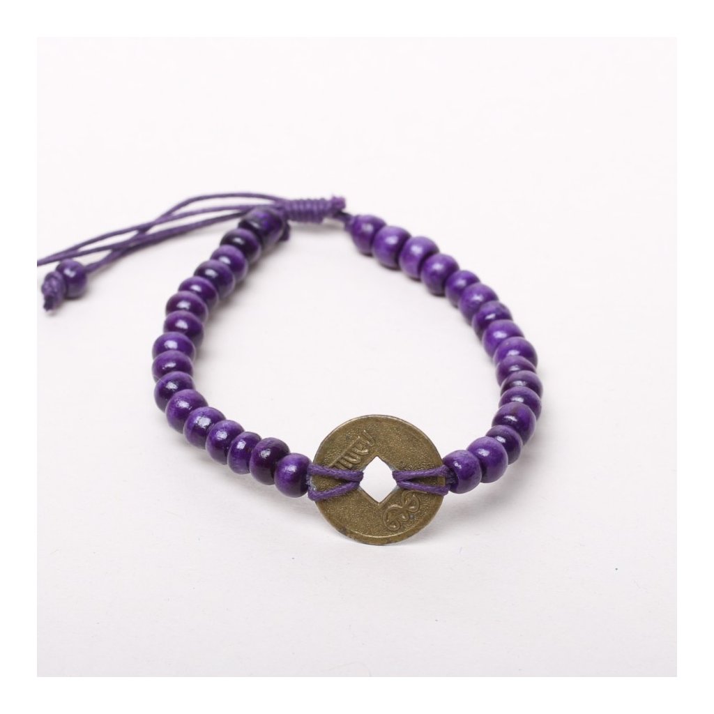 Fialový dřevěný náramek s čínskou mincí štěstí