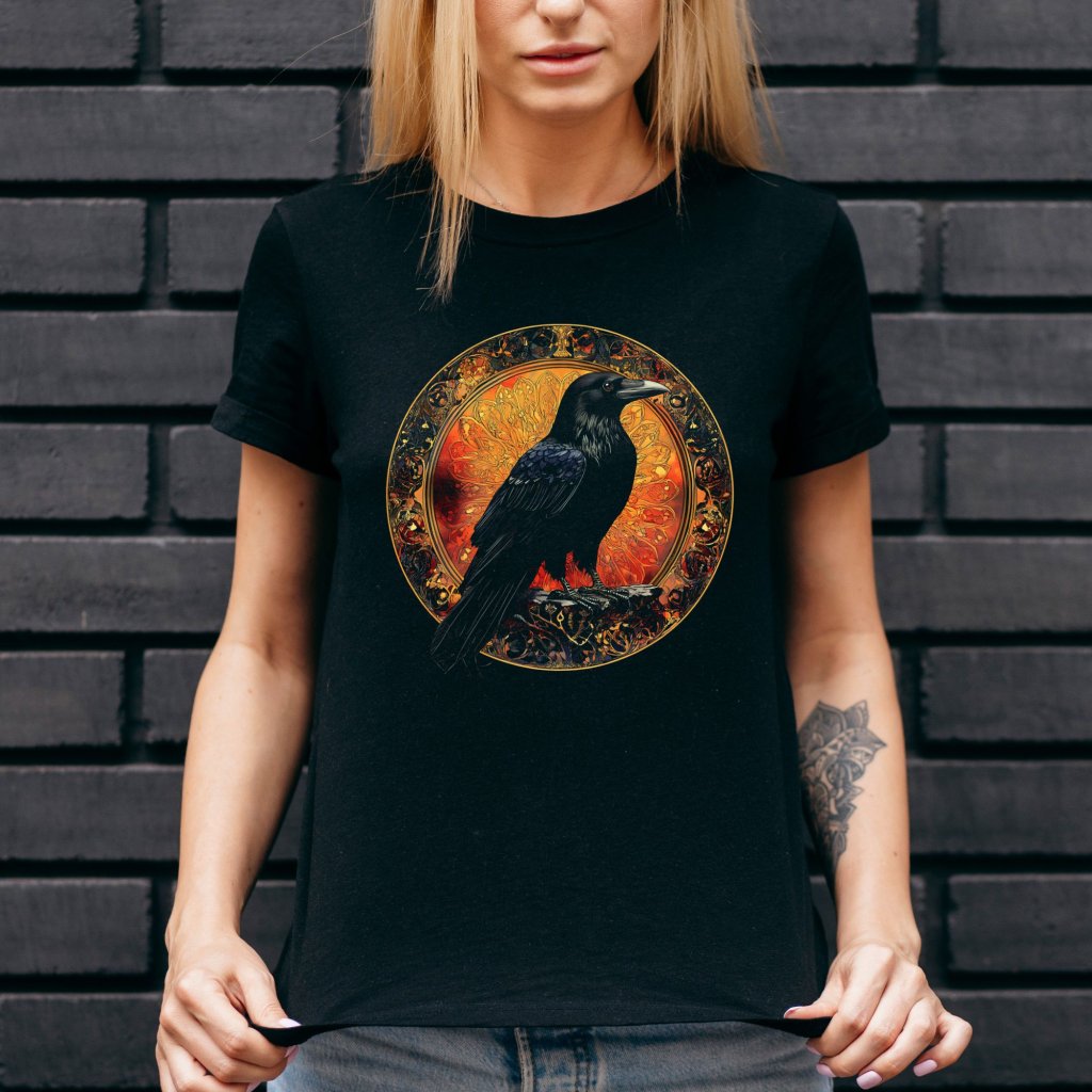 Příběh motivu: Havran je od nepaměti symbolem proroctví, vědění a mostu mezi světem lidí a božským řádem. V severské, keltské i slovanské tradici býval spojován s věštci, bohy a předtuchami. Tento motiv ukazuje havrana v soustředěné pozici – obráceného do středu ohnivého kruhu, kde se sbíhají síly proměny, odvahy a zjevení. Je to duchovní strážce, který přináší odpovědi těm, kdo se odváží ptát.