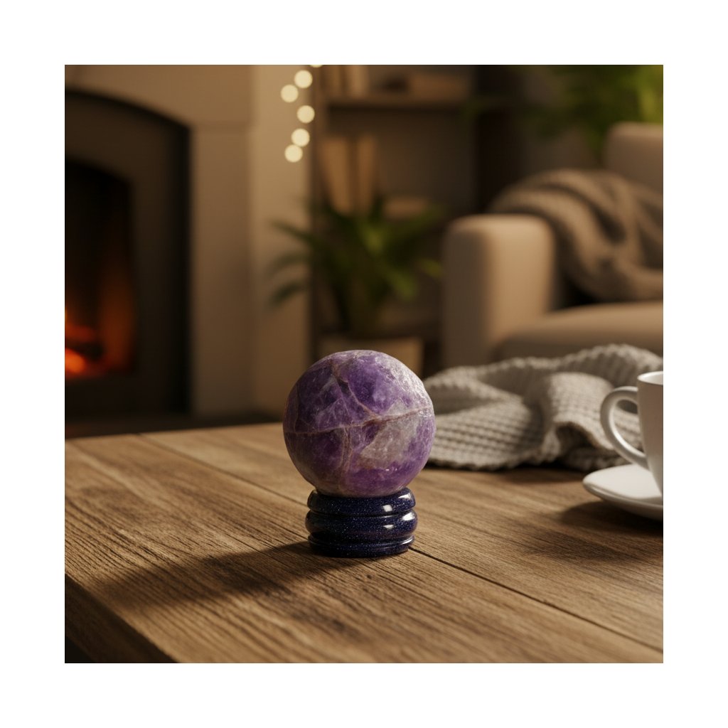 Tento ametystový křišťál s intenzivní fialovou barvou symbolizuje majestátní energii planety Jupiter a je známý svou krásou i aura mystiky. Kulovitý kámen o průměru 40 mm spočívá na pevně zpracovaném podstavci ze zlatého kamene (3×15 mm), který dodává celku stabilitu a luxusní vzhled.