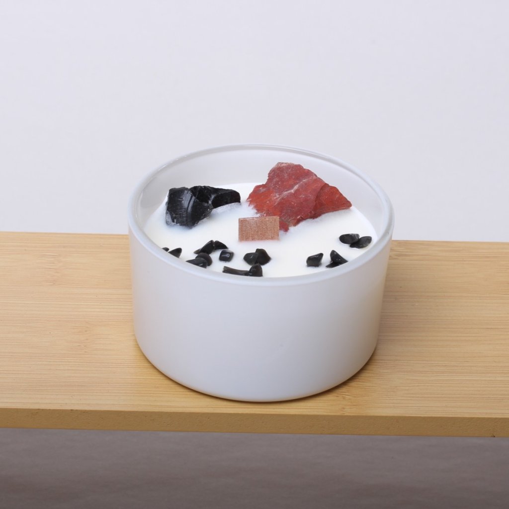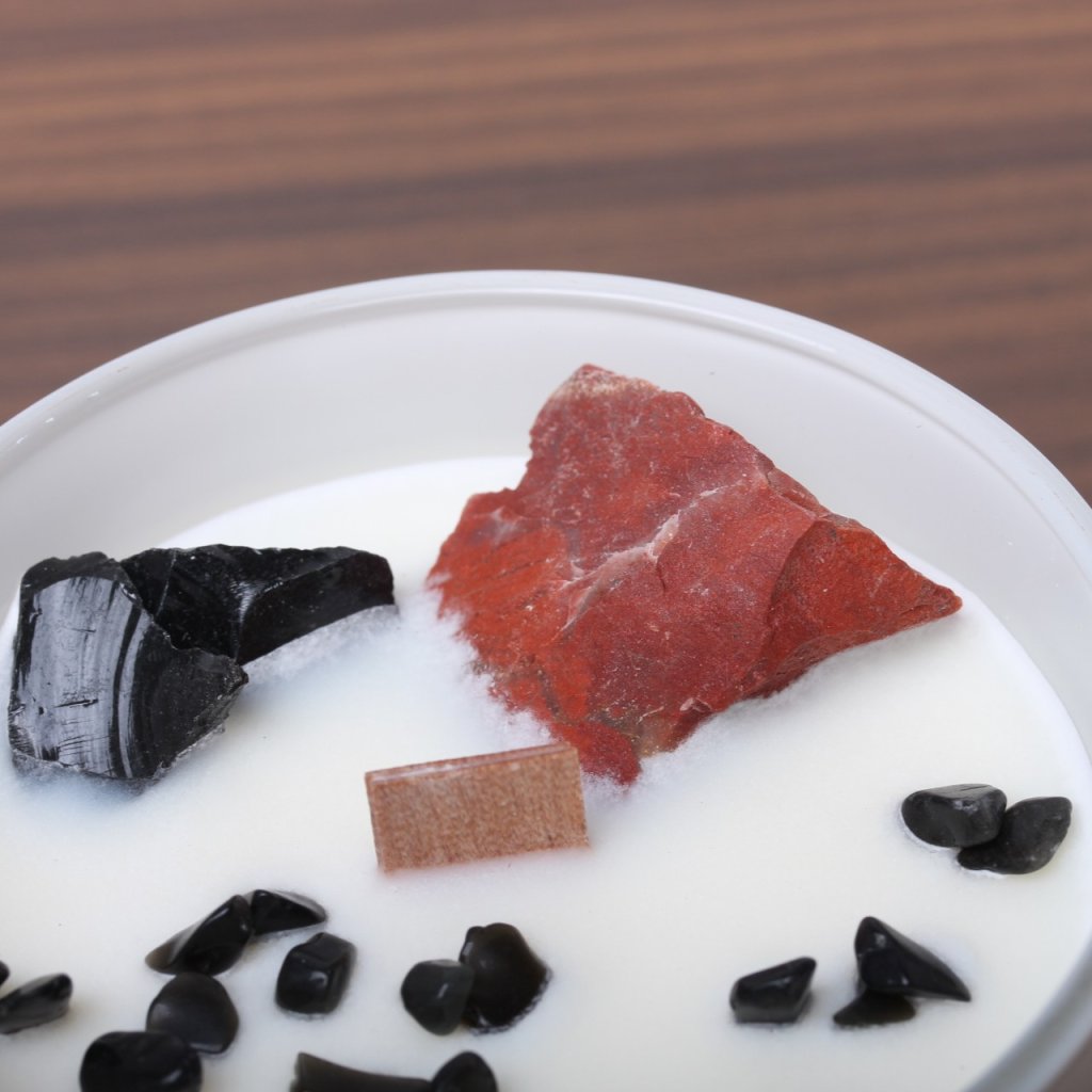 - Složení: sójový vosk, přírodní esenciální oleje, červený jaspis, černý achát, dřevěný knot
