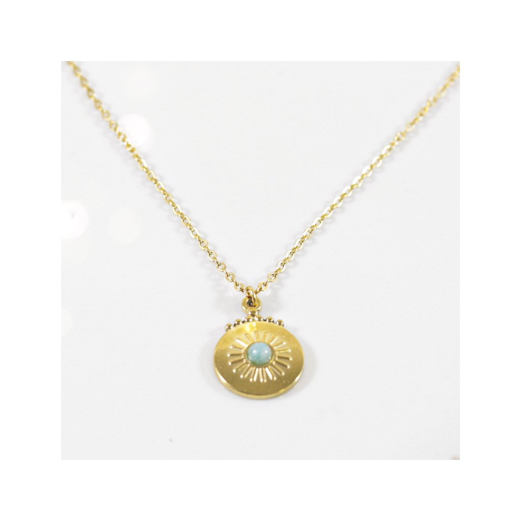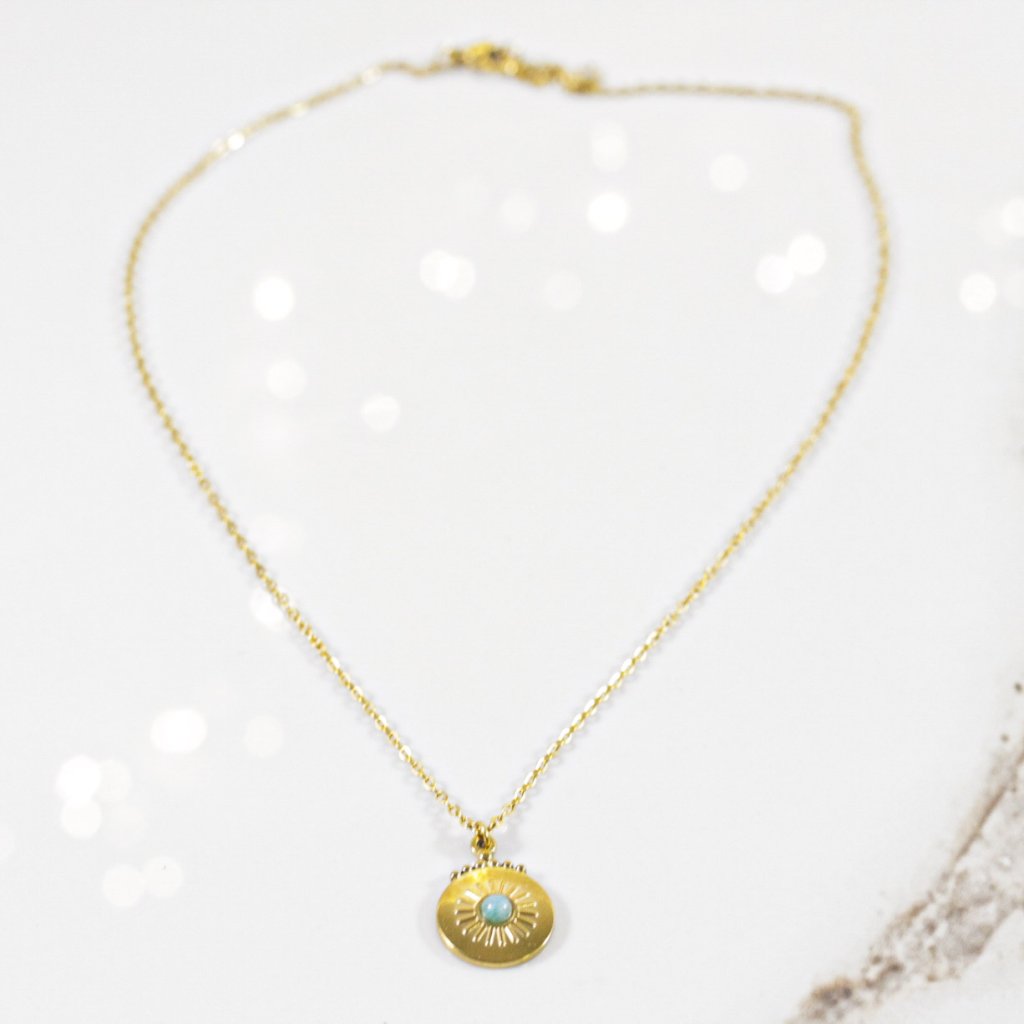 Amazonit je kámen, který podporuje komunikaci, pravdivost a sebevyjádření bez strachu. Je známý svou schopností harmonizovat vnitřní napětí a pomoci nám sladit mysl s emocemi. Jeho jemná zelenkavá barva uklidňuje a posiluje zároveň – a to nejen vizuálně, ale i energeticky. V kombinaci se slunečním motivem ve středu přívěsku působí jako světlo v mlze – připomínka vlastní síly.