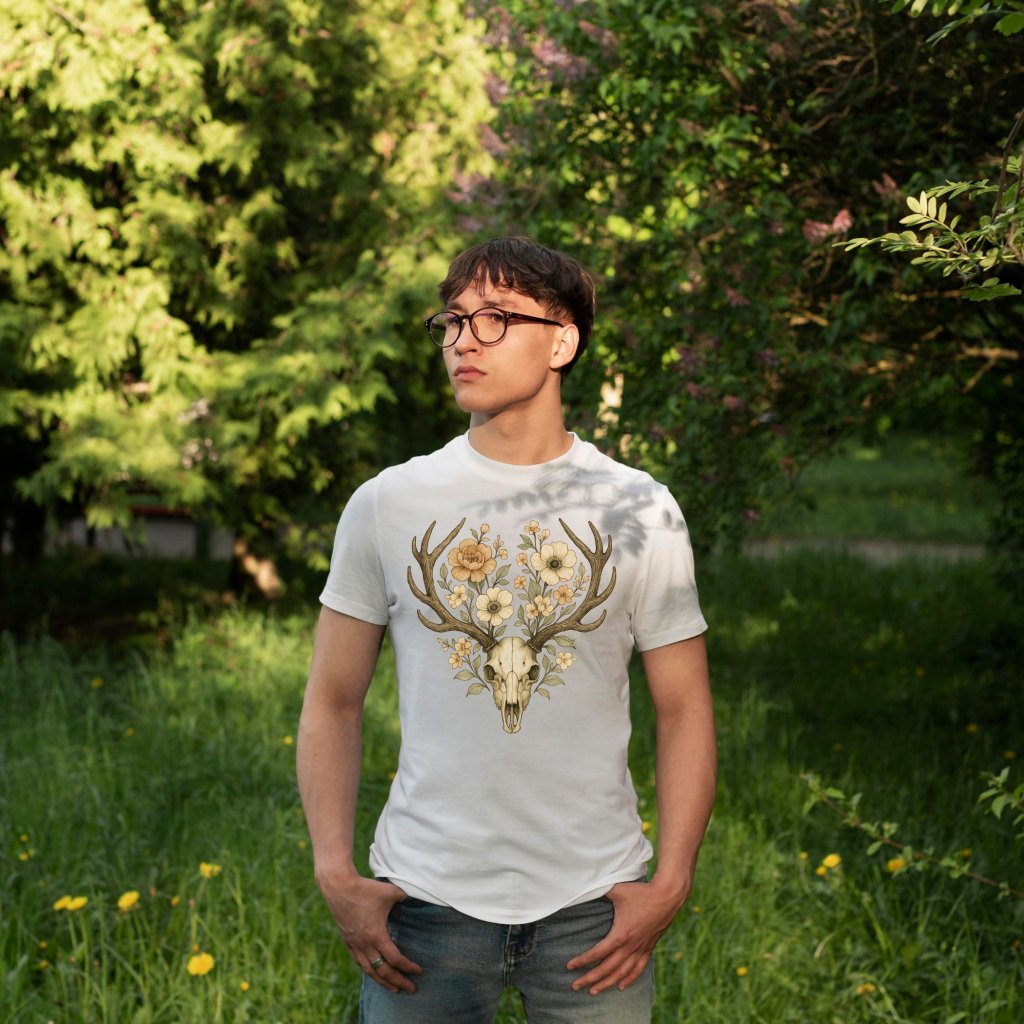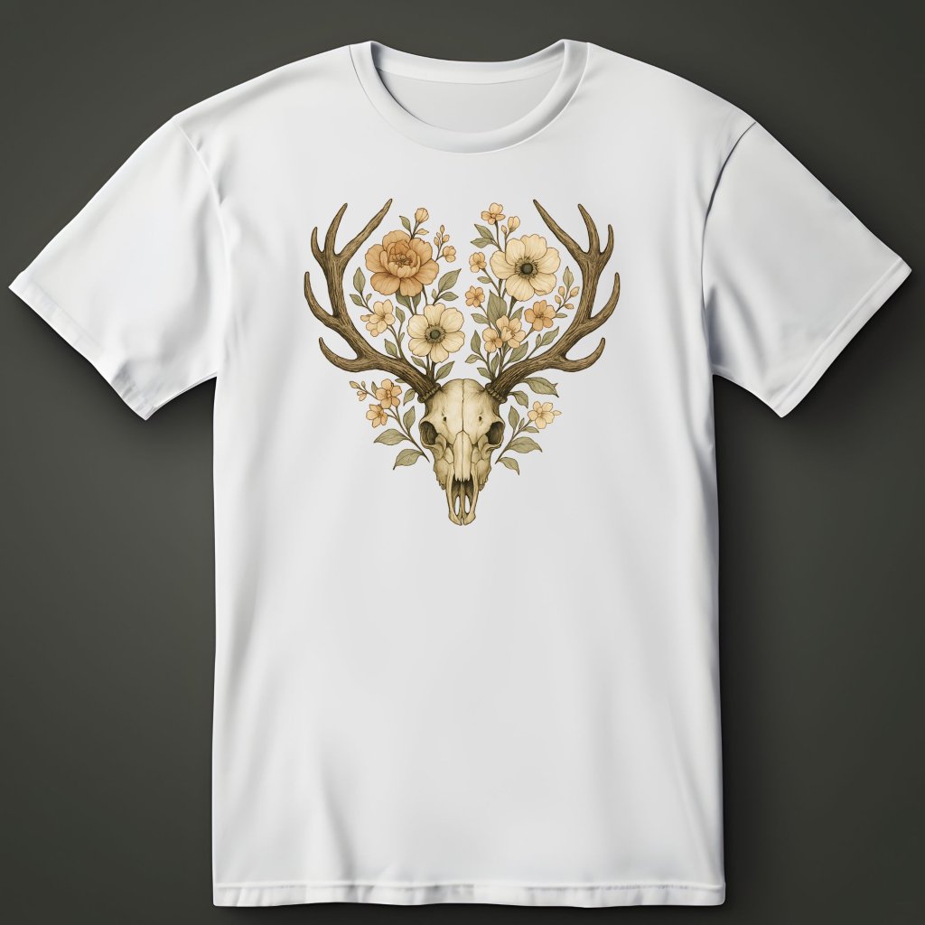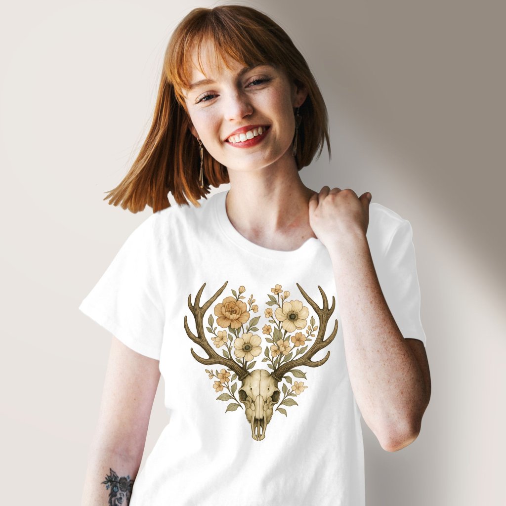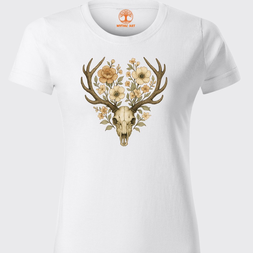 Příběh motivu: Jelení lebka s parožím je pradávný symbol smrti i znovuzrození. V mnoha kulturách bývala součástí rituálů, které uctívaly proměnu, spojení se zemí i duchem. Parohy jsou znakem síly, moudrosti a růstu, zatímco květiny kolem představují křehkost, kterou nosíme i v těch nejtěžších chvílích. Tento motiv připomíná, že i z ticha a ztráty může vyrůst nová síla – jen jiná, hlubší.