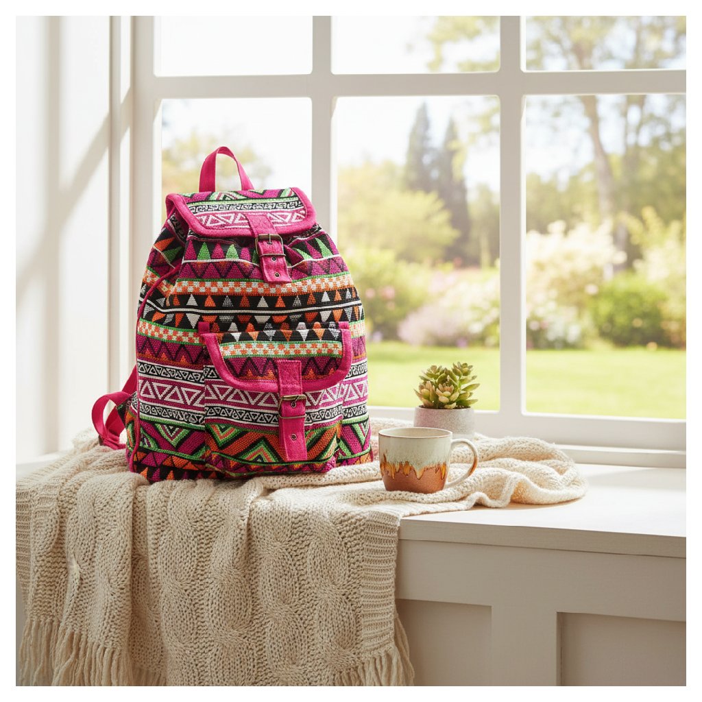 Růžová Aura – Etno Batoh je tradiční a zároveň moderní batoh inspirovaný nepálským designem, přímo dovezený z Indie. Tento etno batoh kombinuje praktickou velikost 28×32 cm s jedinečným ručně tkaným vzorem, což z něj činí ideální volbu pro každodenní použití i volnočasové aktivity.