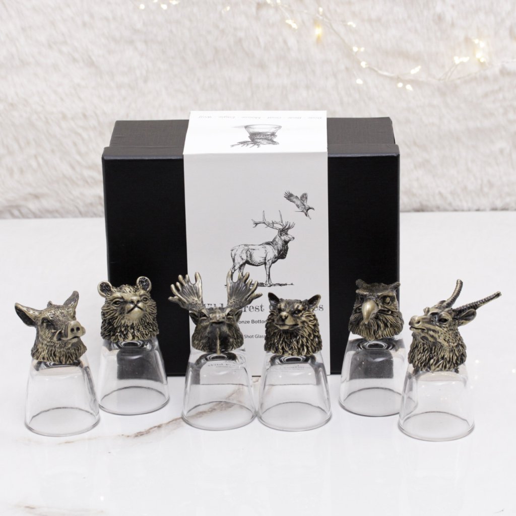 Tato výjimečná sada 6 odlivek oslavuje sílu a mystiku divoké přírody. Každá sklenice o objemu 50 ml spočívá na tvarovaném mosazném podstavci, který po otočení odhaluje detailní podobu jednoho ze šesti lesních tvorů – jelena, medvěda, orla, kozy, kance a vlka. Z obyčejného pití se stává rituál, v němž se snoubí divokost, symbolika a ruční řemeslné zpracování.