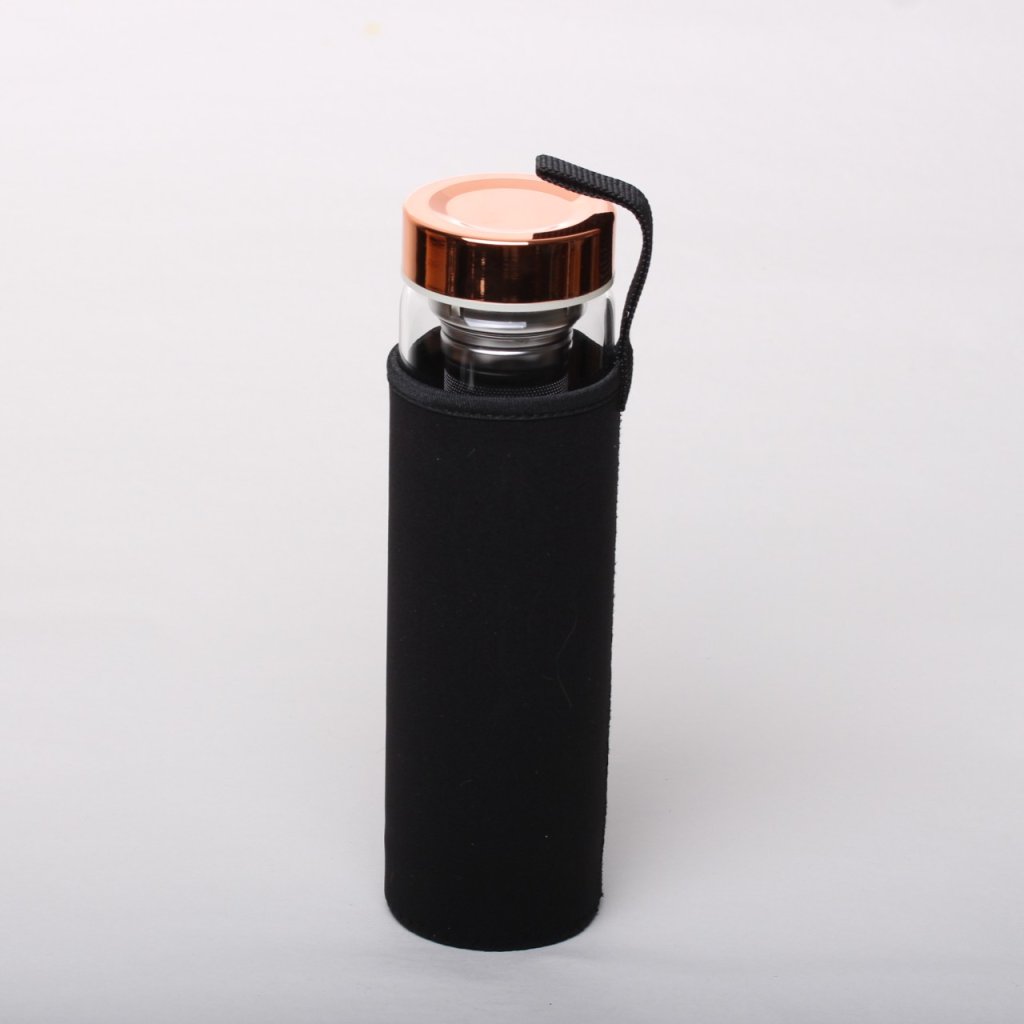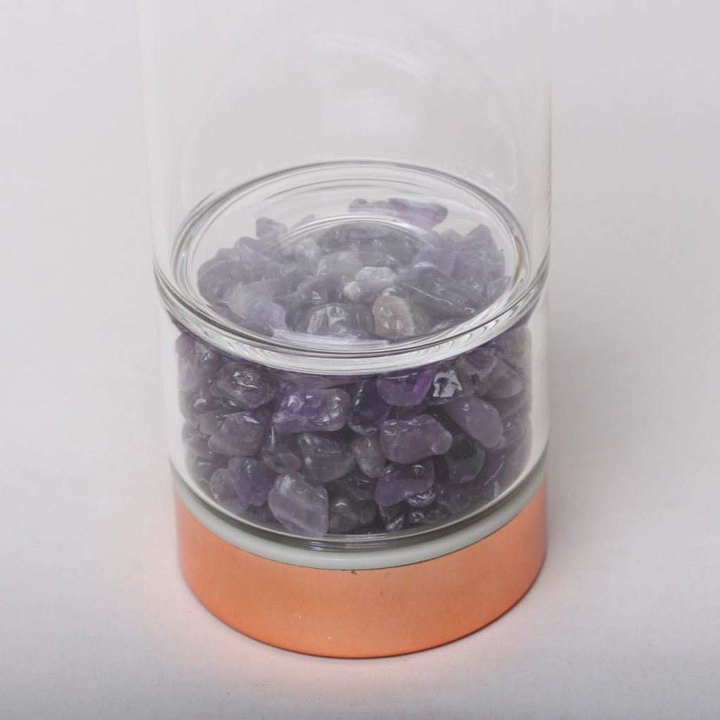 Víčko v odstínu růžového zlata dodává láhvi nádech luxusu a zároveň zajišťuje těsné uzavření bez rizika úniku tekutin. Součástí balení je praktický neoprenový obal, který usnadňuje přenášení a chrání láhev před poškozením i teplem. V dolní části láhve jsou umístěny přírodní kameny ametystu – minerálu známého svými uklidňujícími a harmonizujícími účinky.