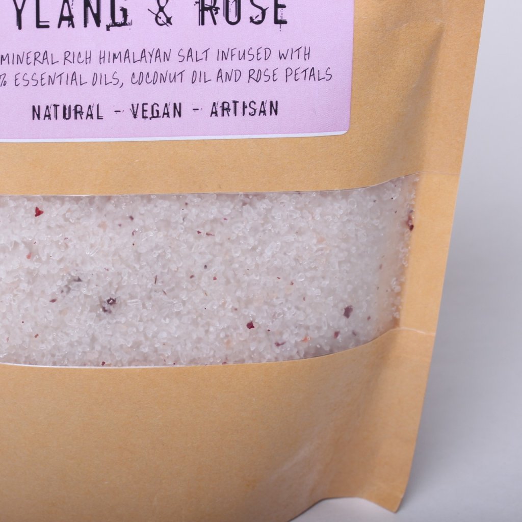 Složení: Himalájská sůl, kokosový olej, sušené růžové plátky, esenciální olej z ylang ylang, přírodní minerály