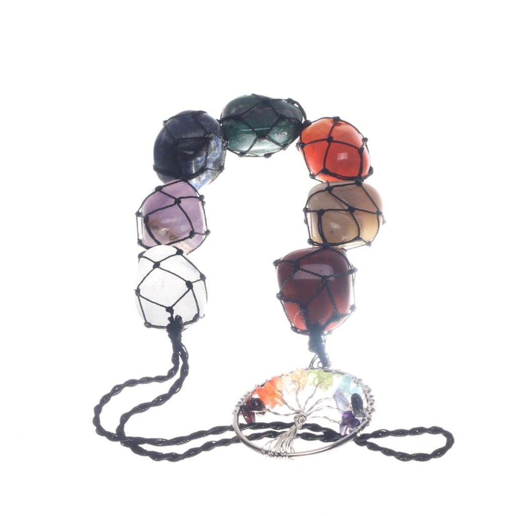 Tento závěsný talisman ve tvaru Stromu života je vytvořen ze sedmi přírodních kamenů, které odpovídají energiím čaker. Každý kámen má svůj význam – ametyst pro intuici, sodalit pro pravdu, zelený a žlutý avanturín pro růst a radost, karneol pro životní sílu, skalní křemen pro čistotu a červený jaspis pro uzemnění. Spolu tvoří harmonii, kterou můžeš zavěsit kdekoliv, kde chceš cítit energii propojení se Zemí a sebou samou.