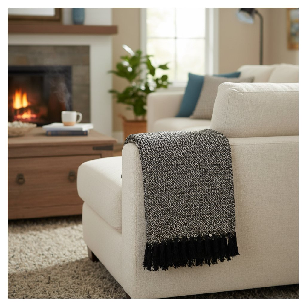 Uhlová Harmonie – Boho Přehoz kombinuje elegantní vzhled a pohodlí v jednom designovém kousku. Hluboká uhlová barva dodává prostoru decentní eleganci a snadno se kombinuje s ostatními dekoracemi.