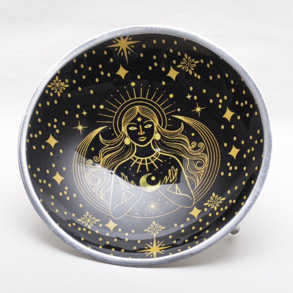Vstupte do posvátného prostoru, kde Bohyně vládne z temnoty. Tento emailem zdobený rituální talíř s motivem Zlaté Bohyně na černém pozadí se stane výjimečným prvkem každého duchovního místa. Díky třem pevným nožkám nabízí stabilní základnu pro rituály, meditace i každodenní duchovní práci.